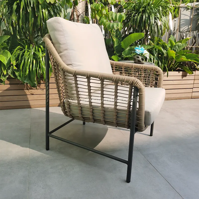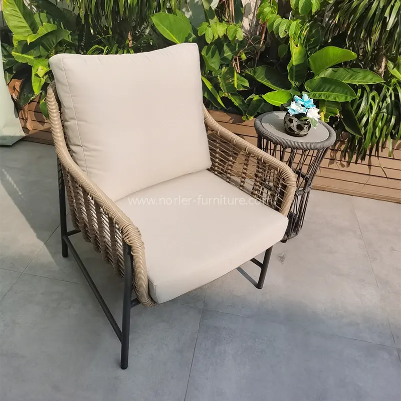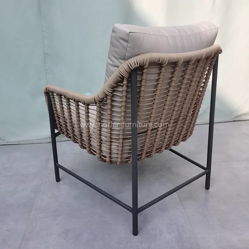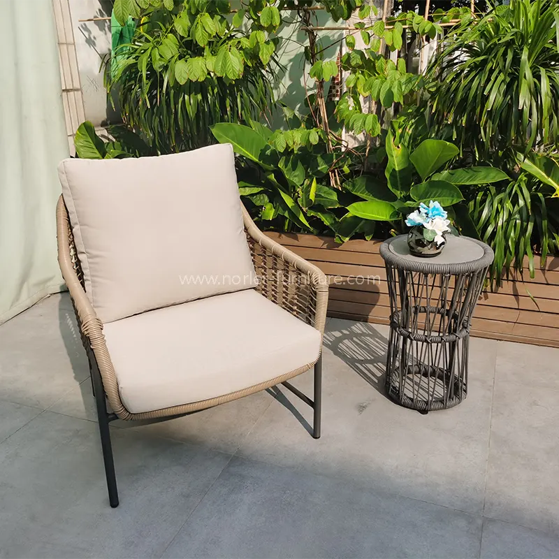 అవుట్డోర్ పె రట్టన్ గార్డెన్ బాల్కనీ టేబుల్ మరియు కుర్చీ తేలికపాటి మరియు ధృ dy నిర్మాణంగల అల్యూమినియం అల్లాయ్ పౌడర్-కోటెడ్ ఫ్రేమ్‌ను సౌకర్యవంతమైన మరియు వాతావరణ-నిరోధక PE రట్టన్ చేతితో నేసిన తో మిళితం చేస్తుంది. సీటు పరిపుష్టి అధిక-సాగే స్పాంజితో కప్పబడిన శీఘ్రంగా ఎండబెట్టడం జలనిరోధిత బట్టతో తయారు చేయబడింది, ఇది శ్వాసక్రియ మరియు సౌకర్యవంతమైనది. మ్యాచింగ్ టేబుల్ కలప ధాన్యం ఆకృతి, జలనిరోధిత మరియు సూర్య-నిరోధకతను కలిగి ఉంటుంది, ఇది సహజ లాగ్ శైలిని ప్రదర్శిస్తుంది. మొత్తం ఆకారం ఆధునిక మరియు సహజమైనది, బాల్కనీలు, డాబాలు, తోటలు మొదలైన వివిధ బహిరంగ ప్రదేశాలకు అనువైనది, సౌకర్యవంతమైన జీవన వాతావరణాన్ని సృష్టిస్తుంది.